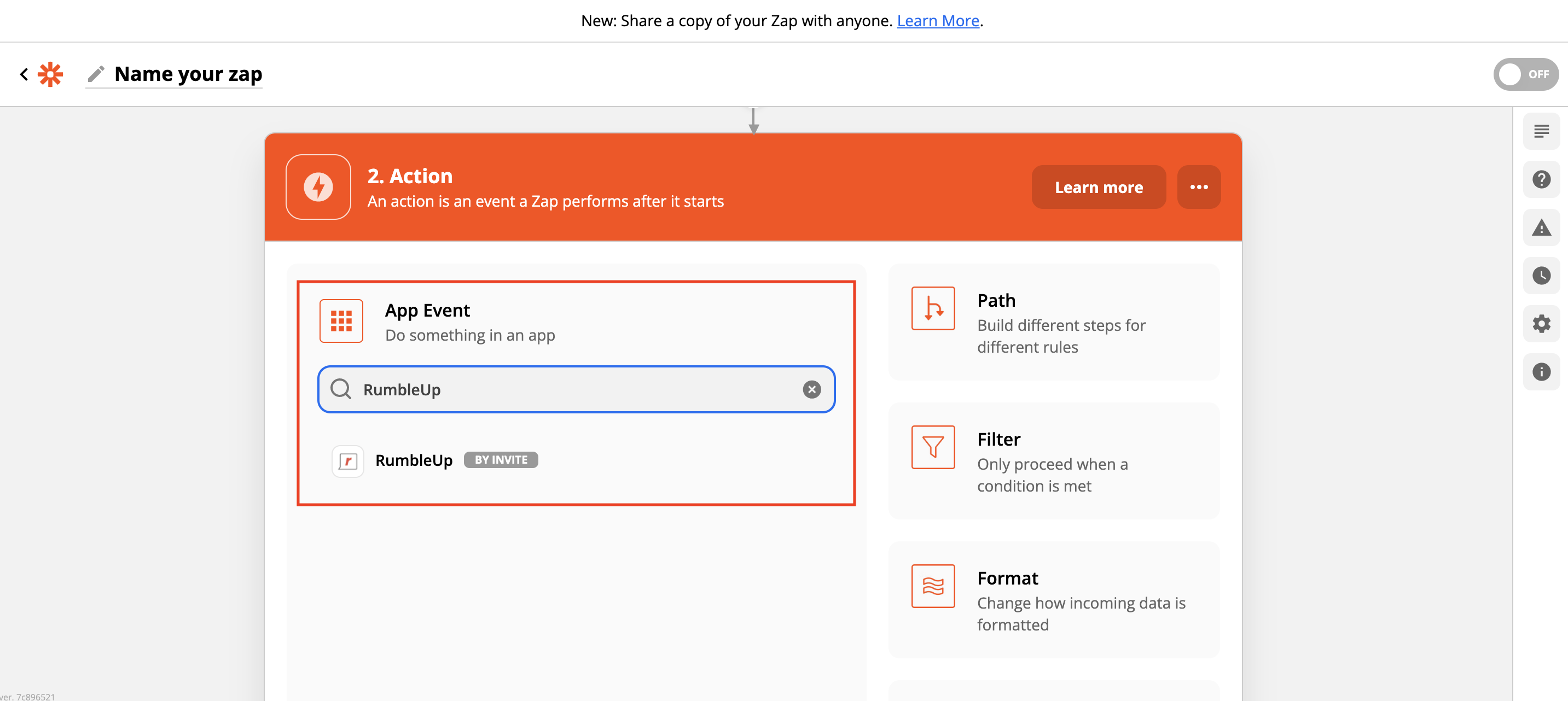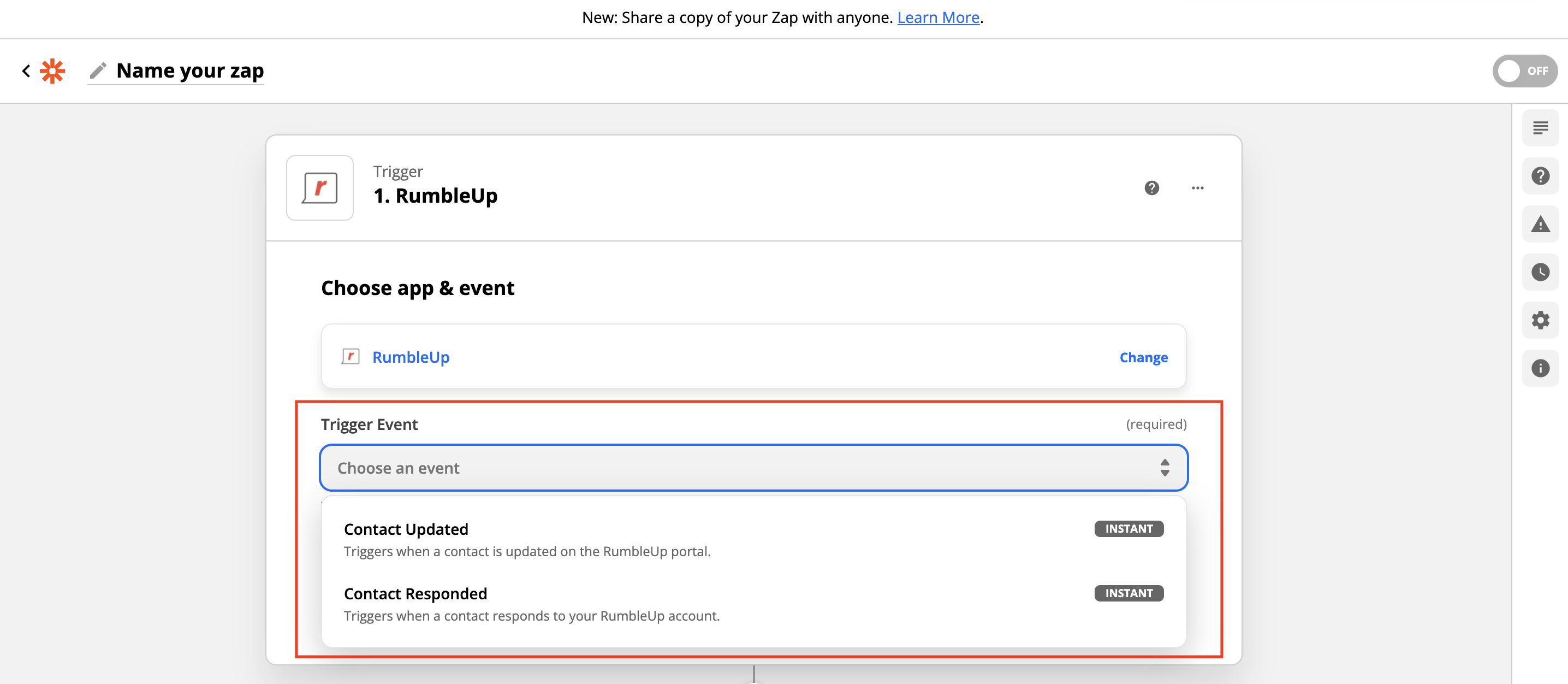 (If you’ve never made a RumbleUp Zap before, you will be asked to sign in. Login information is available at Integrations -> API Keys).